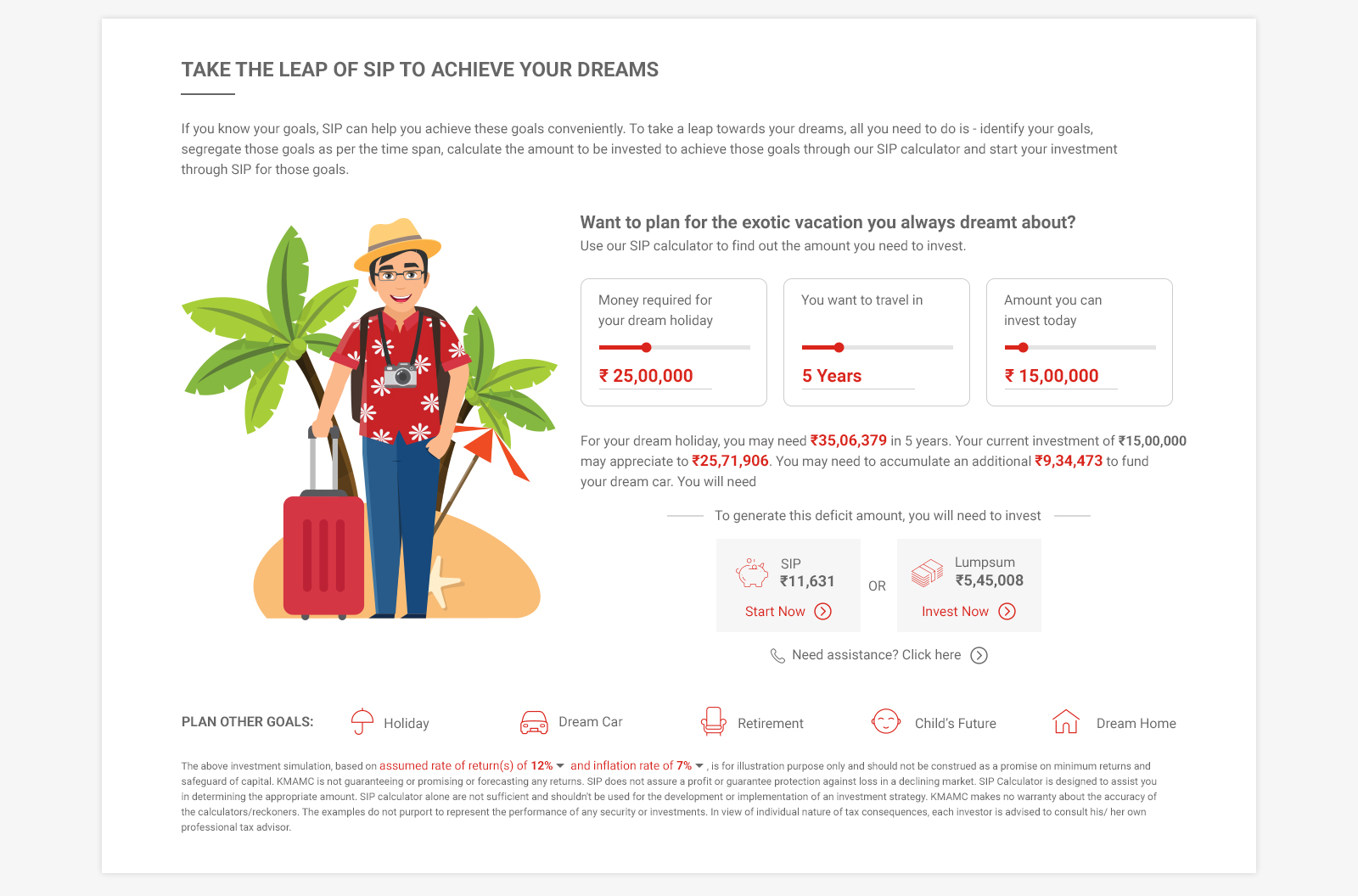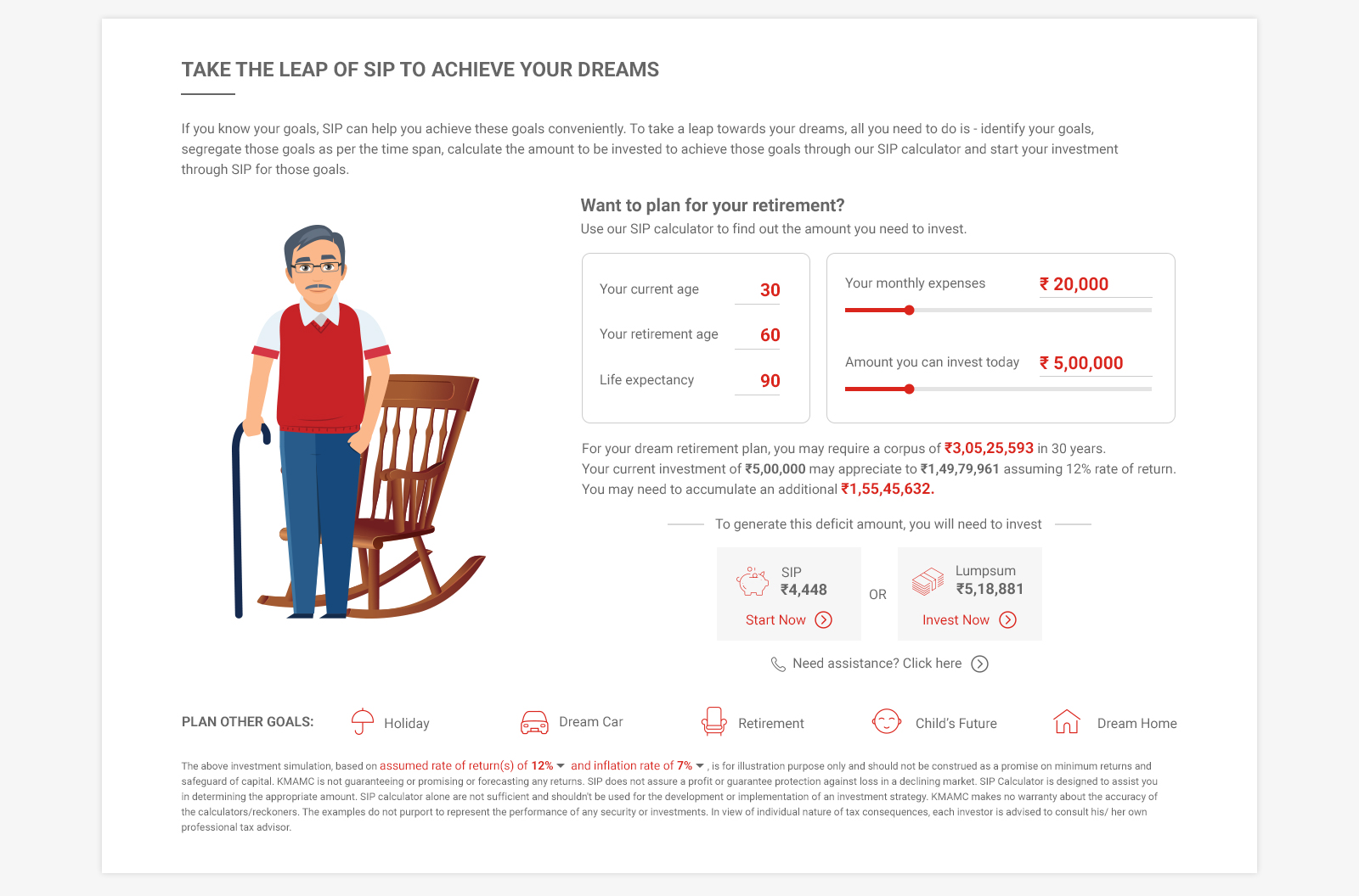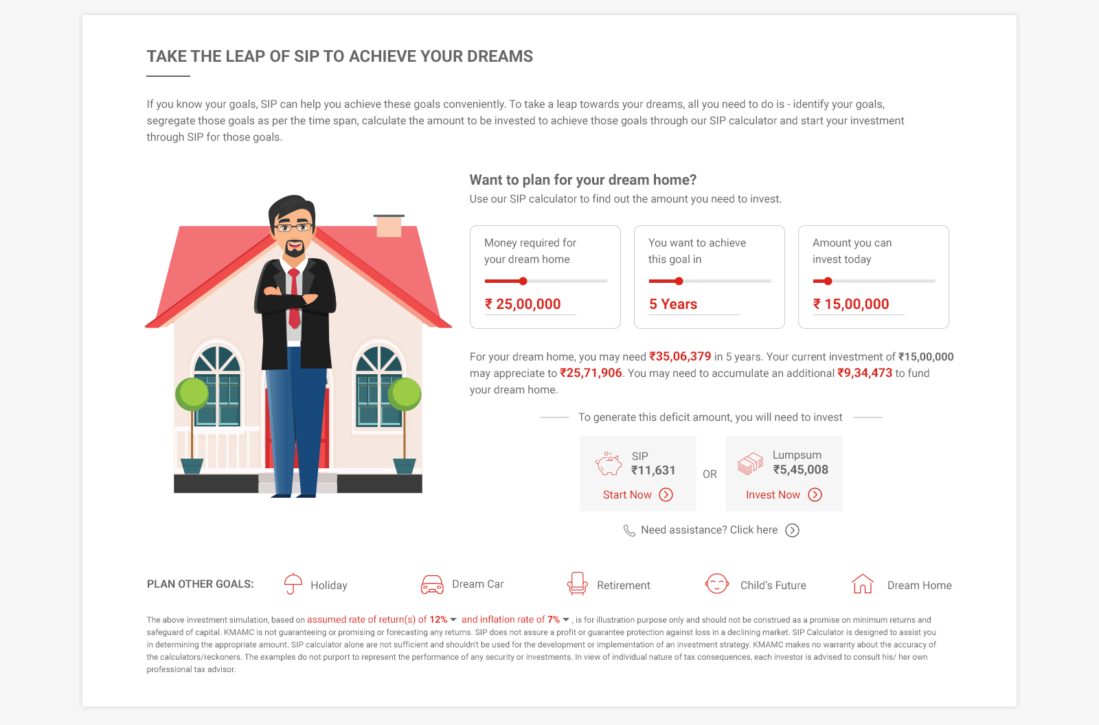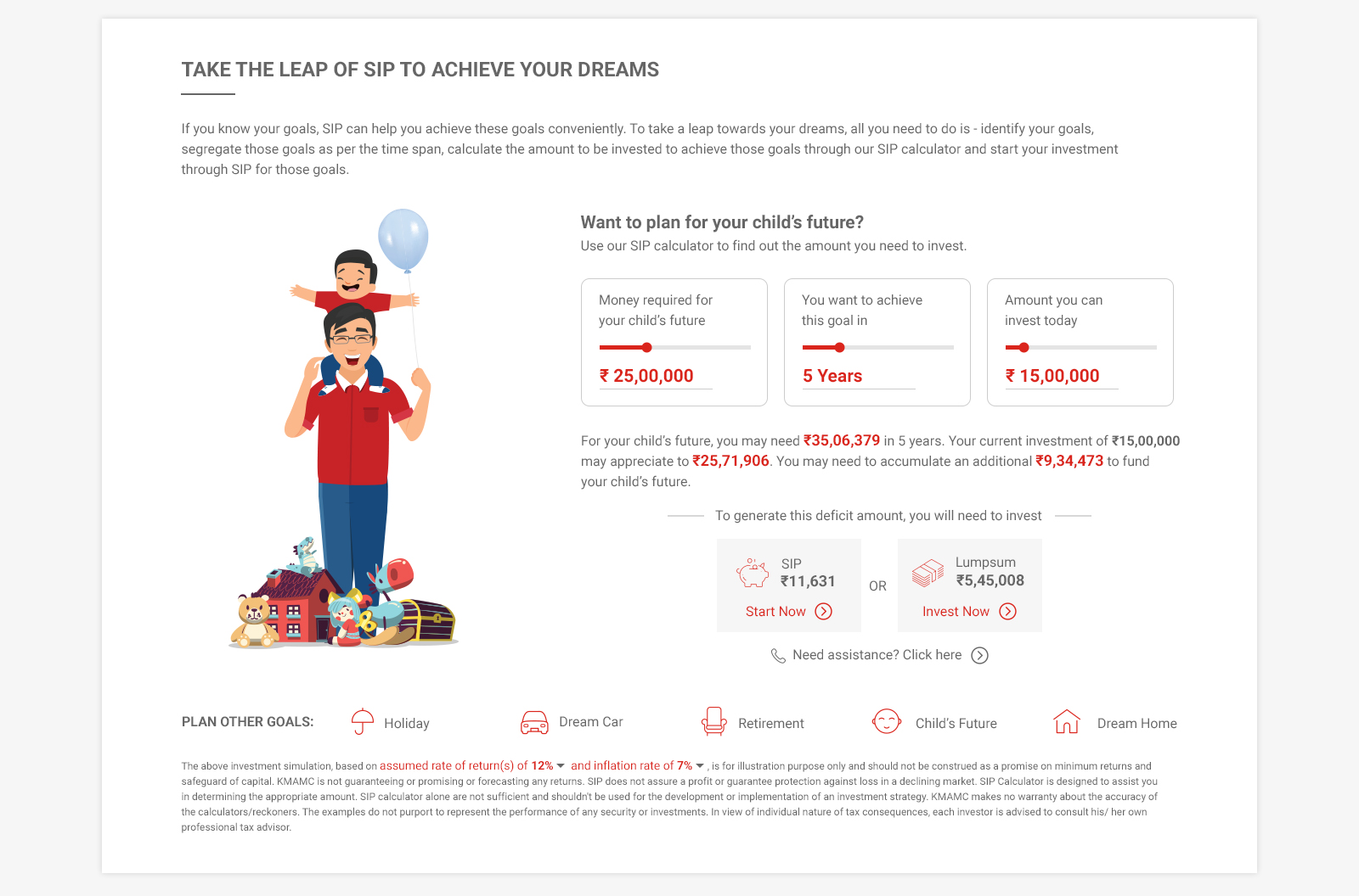 Develop an interactive and user-friendly interface for the SIP calculator with customization options. Overall, our goal will be to create an interface that not only meets the functional needs of Kotak mutual fund customers, but also provides an enjoyable and educational experience that encourages them to explore and invest in these funds over the long term.